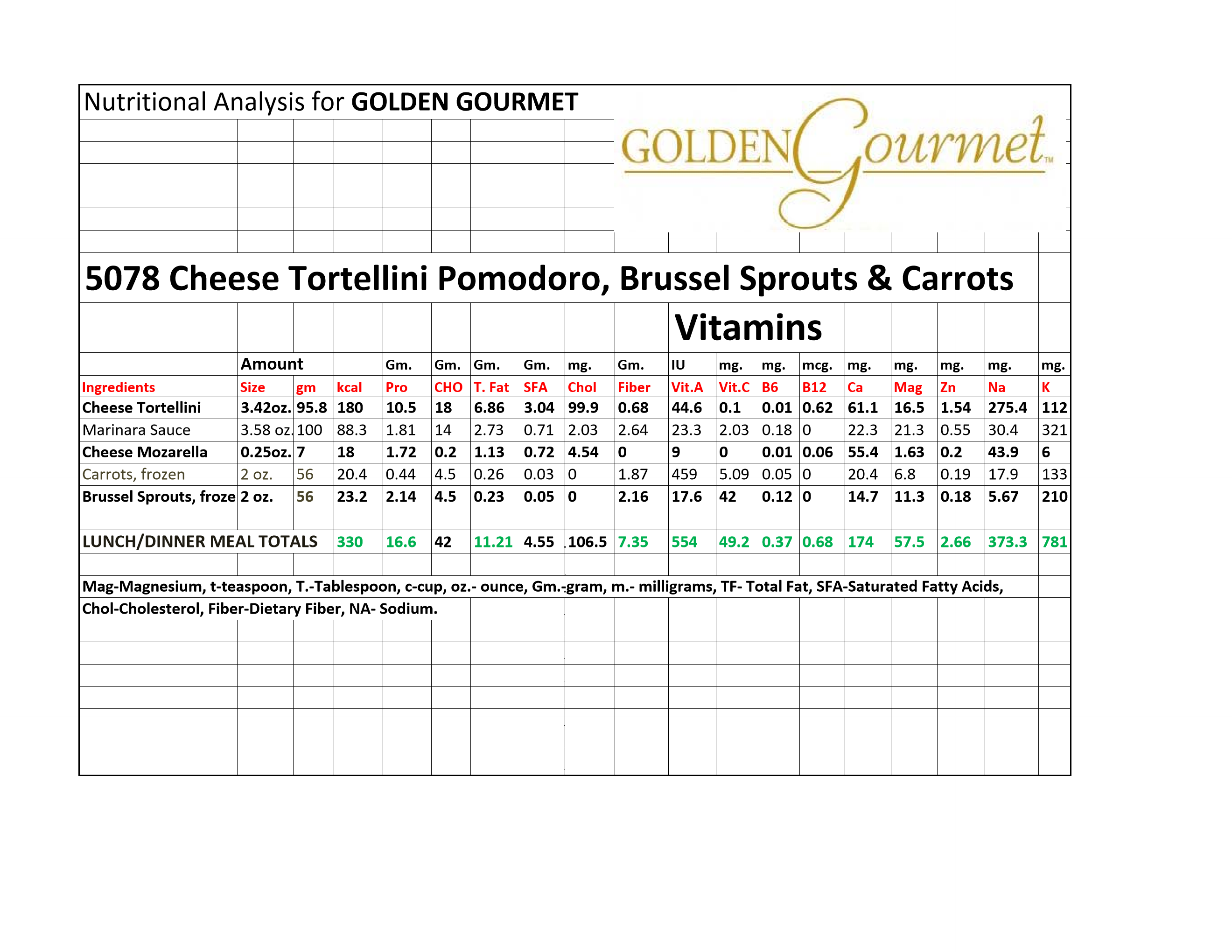 Cheese Tortellini & Mozzarella Cheese W Marinara Sauce Brussels Sprouts Carrots 1 Count Packs - 20 Per Case.