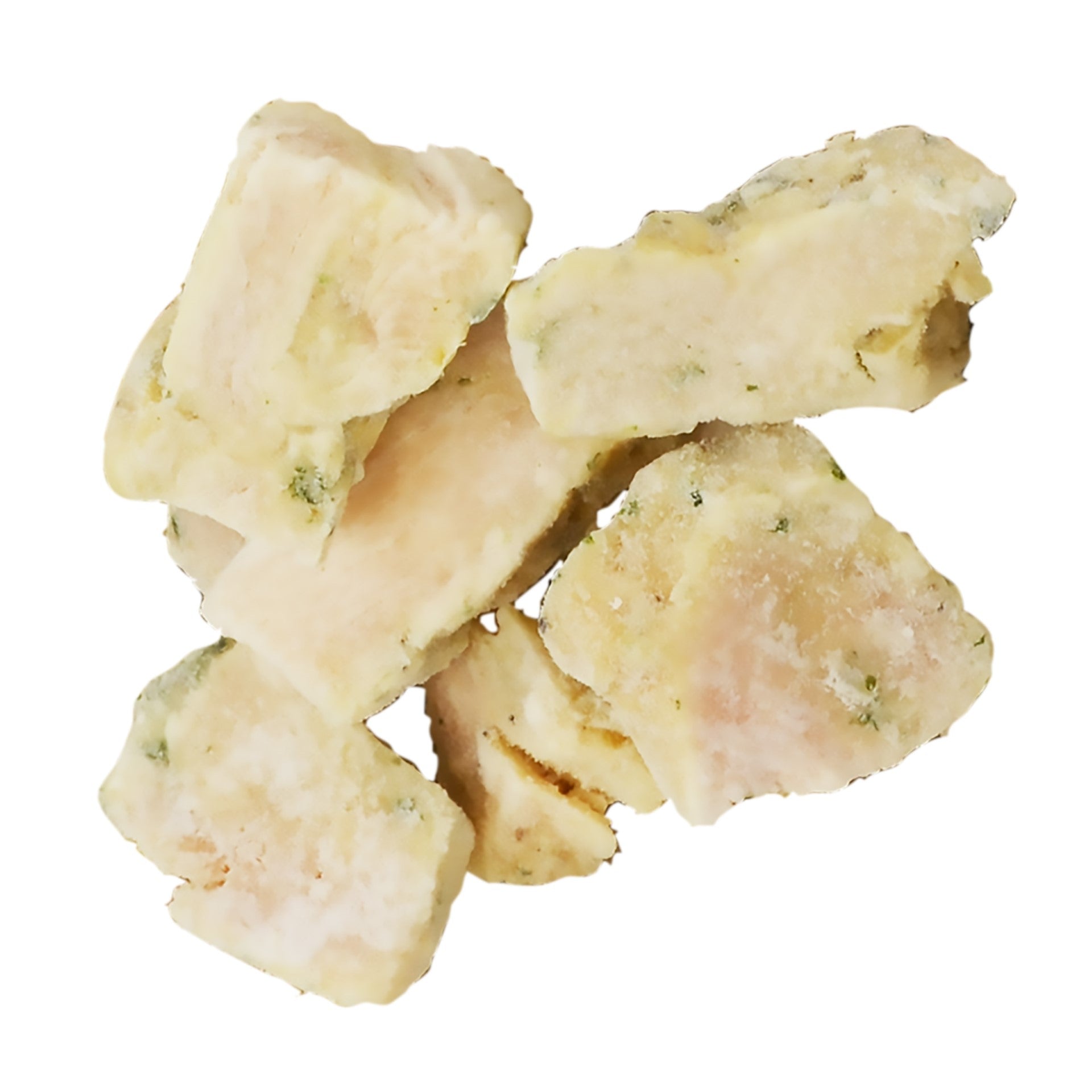 Whole muscle chicken breast strips marinated and seasoned with a blend of Romano cheese, garlic and herbs.