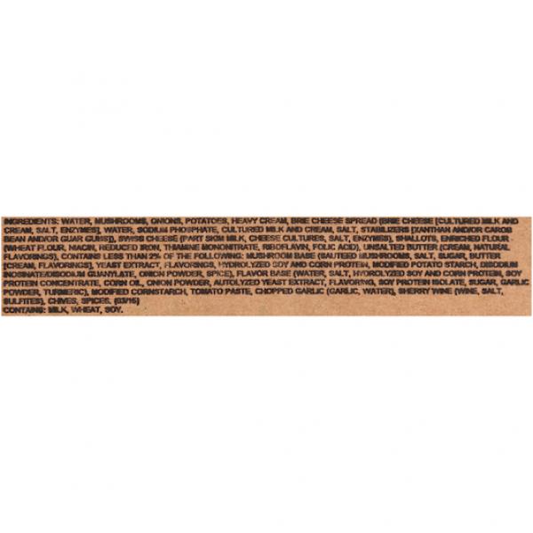 Ingredients: Water, Mushrooms, Onions, Heavy Cream (from Milk), Brie Cheese Spread (brie Cheese [cultured Milk And Cream, Salt, Enzymes], Water, Sodium Phosphate, Cultured Milk And Cream, Salt, Stabilizers [xanthan And/or Carob Bean And/or Guar Gums]), Swiss Cheese (part-skim Milk, Cheese Cultures, Salt, Enzymes), Shallots, Enriched Flour (wheat Flour, Niacin, Reduced Iron, Thiamine Mononitrate, Riboflavin, Folic Acid), Unsalted Butter (cream, Natural Flavorings), Contains Less Than 2% Of Potato Flakes, Modified Food Starch, Tomato Paste, Sherry Wine, Salt, Chopped Garlic, Yeast Extract, Soy Sauce, Chives, Mushroom Juice Powder (maltodextrin, Mushroom Juice Concentrate), Butter, Soy Protein Concentrate, Spices, Potato Flour, Molasses, Onion Powder, Natural Flavor (contains Celery), Sugar, Garlic Powder, Soy Protein Isolate, Turmeric (spice And Color).