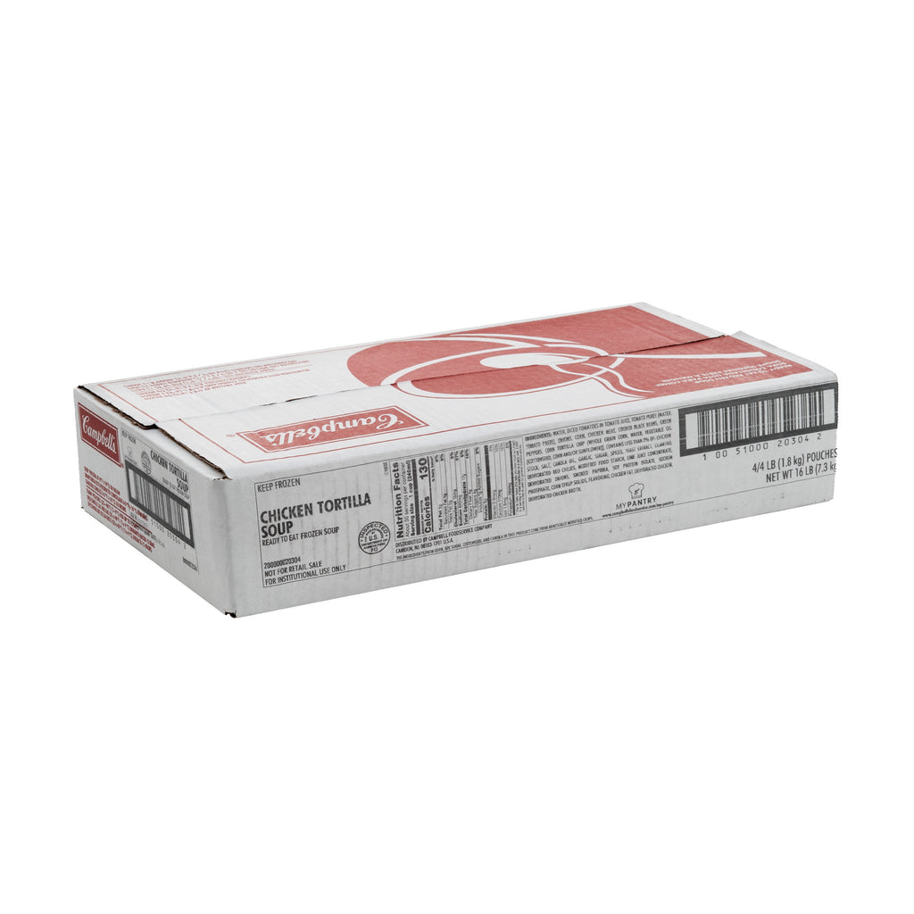 A bowl of our Chicken Tortilla Soup, served with a piece of cornbread, is hearty enough to serve on its own, or you can premium-ize it with whatever's fresh in your kitchen. This frozen soup has a storage life of 638 days in your freezer and yields approximately 384 fluid ounces of hearty soup. At Campbell's Foodservice, we make carefully crafted soups, so you can be proud to use and serve them all year long. Made with carefully selected ingredients with options rich in protein, fiber, or vitamins, our soups are full of what guests love, not what they don't.