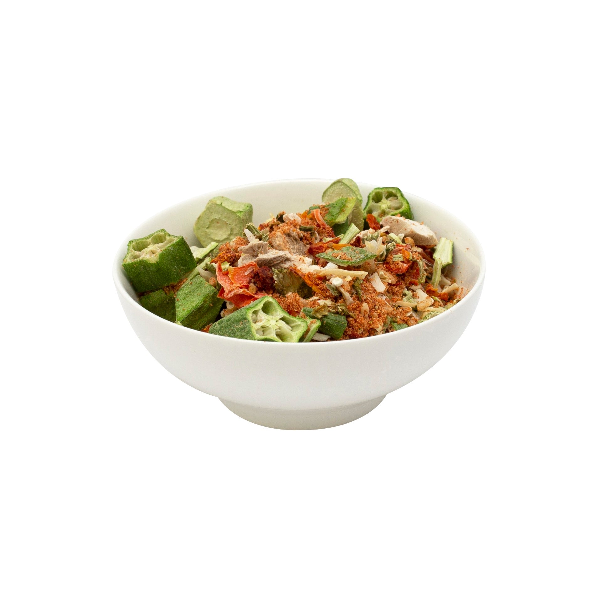 Ingredients: Dehydrated Vegetables (tomatoes, Onion (sulphites), Okra, Celery, Carrots), Instant Long Grain Rice, Dehydrated Chicken Meat, Modified Corn Starch, Sea Salt, Chicken Fat, Corn Syrup Solids, Sugar, Autolyzed Yeast Extract, Spices, Calcium Silicate (anti-ca