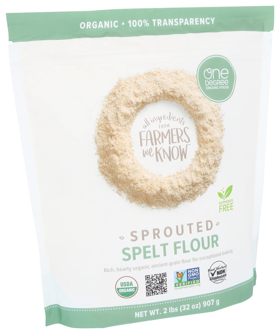 One Degree Organic Foods Flour, Organic Sprouted Spelt Flour Is A Non-gmo Project Verified Ancient Grain, A Favorite Protein Source For Many Vegetarians. It's Grown Using Veganic Farming Methods, Retaining 100% Of The Grain's Bran And Germ, And Preserve Nutrients By Keeping Temperatures Low When Processing. This Flour Is Kosher, Non-gmo, Organic, Whole Grain And Vegan. There Are No Chemicals Or Animal By-products. Each Bag Contains 32 Oz. Of Flour.