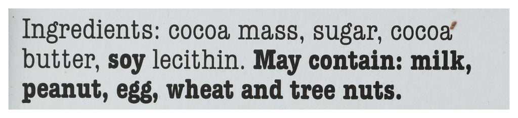 Ingredients: Cocoa Mass, sugar, cocoa Butter, soy Lecithin