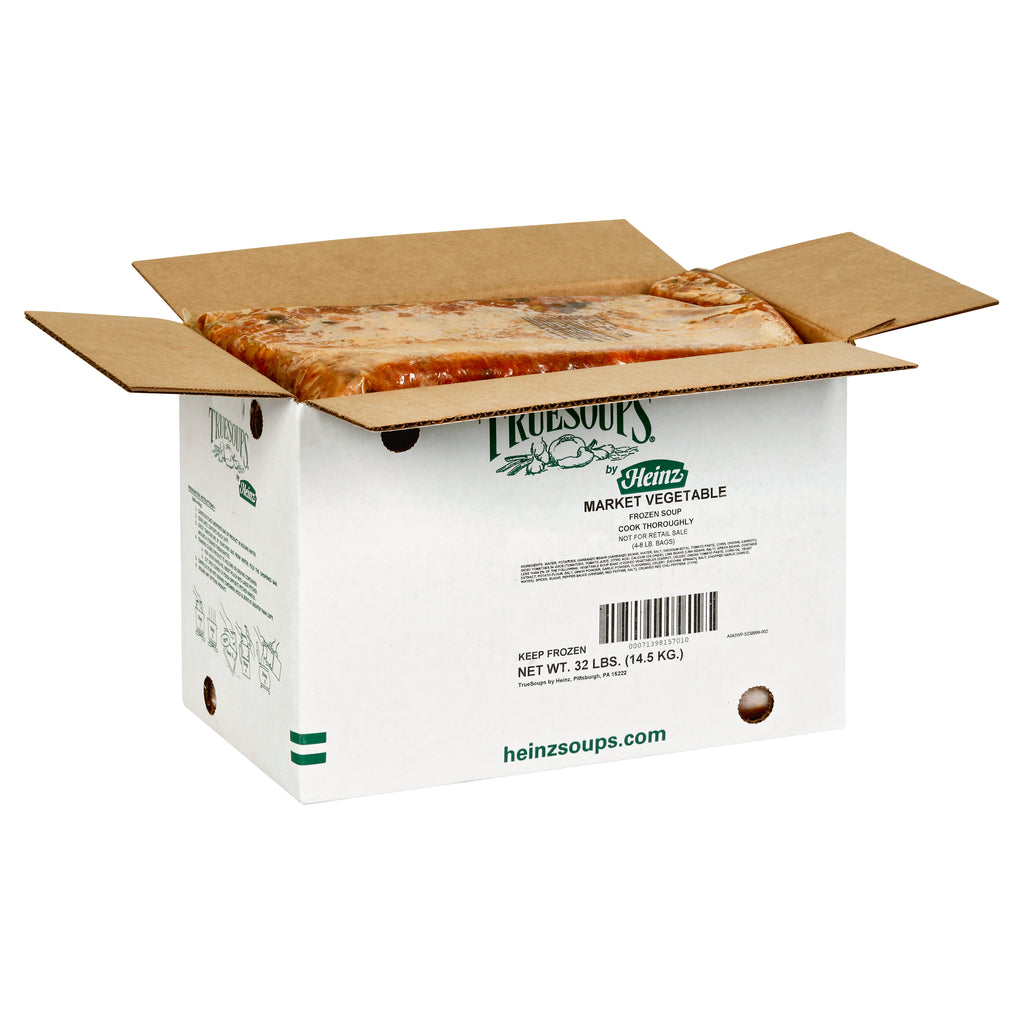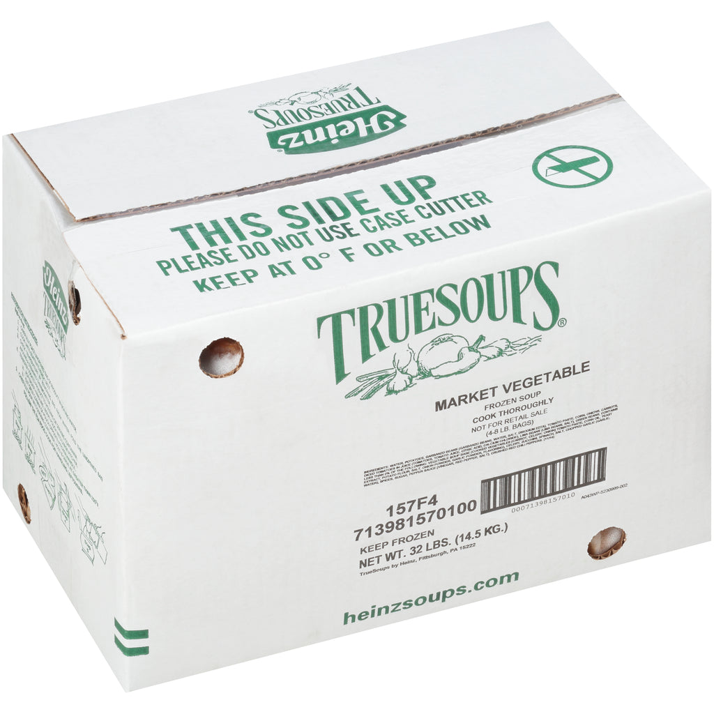 TRUESOUPS Market Vegetable Soup - 8 lb. bag, 4 per case A melange of fresh vegetables - carrot, celery, onion, spinach, potato, zucchini and tomato braised in an herb scented vegetable broth with baby lima, garbanzo and green beans. Frozen, Ready to Use