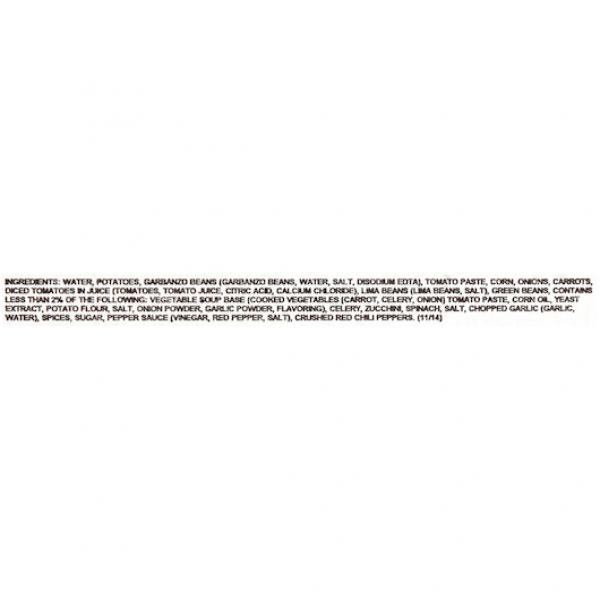Ingredients: Water, Potatoes, Tomato Paste, Corn, Onions, Carrots, Diced Tomatoes In Juice, Lima Beans, Green Beans, Contains Less Than 2% Of Chickpeas, Celery, Zucchini, Spinach, Cooked Vegetables (carrot, Celery, Onion), Salt, Chopped Garlic, Corn Oil, Potato Flour, Yeast Extract, Spices, Sugar, Pepper Sauce (vinegar, Red Pepper, Salt), Onion Powder, Garlic Powder, Crushed Red Chili Peppers, Natural Flavor, Calcium Chloride.