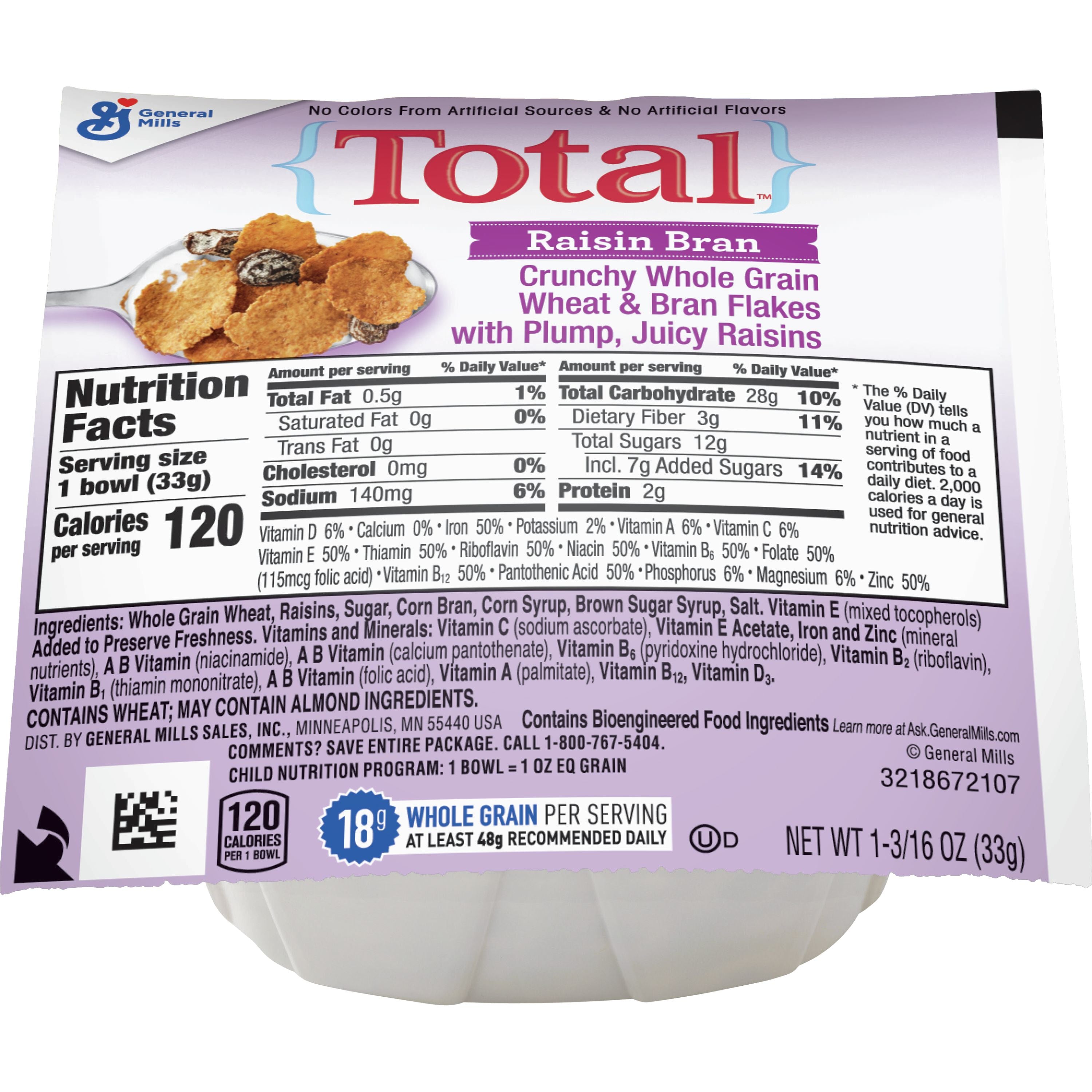Total Raisin Bran Cereal Single Serve Bowlpak 1.19 Ounce Size - 96 Per Case.