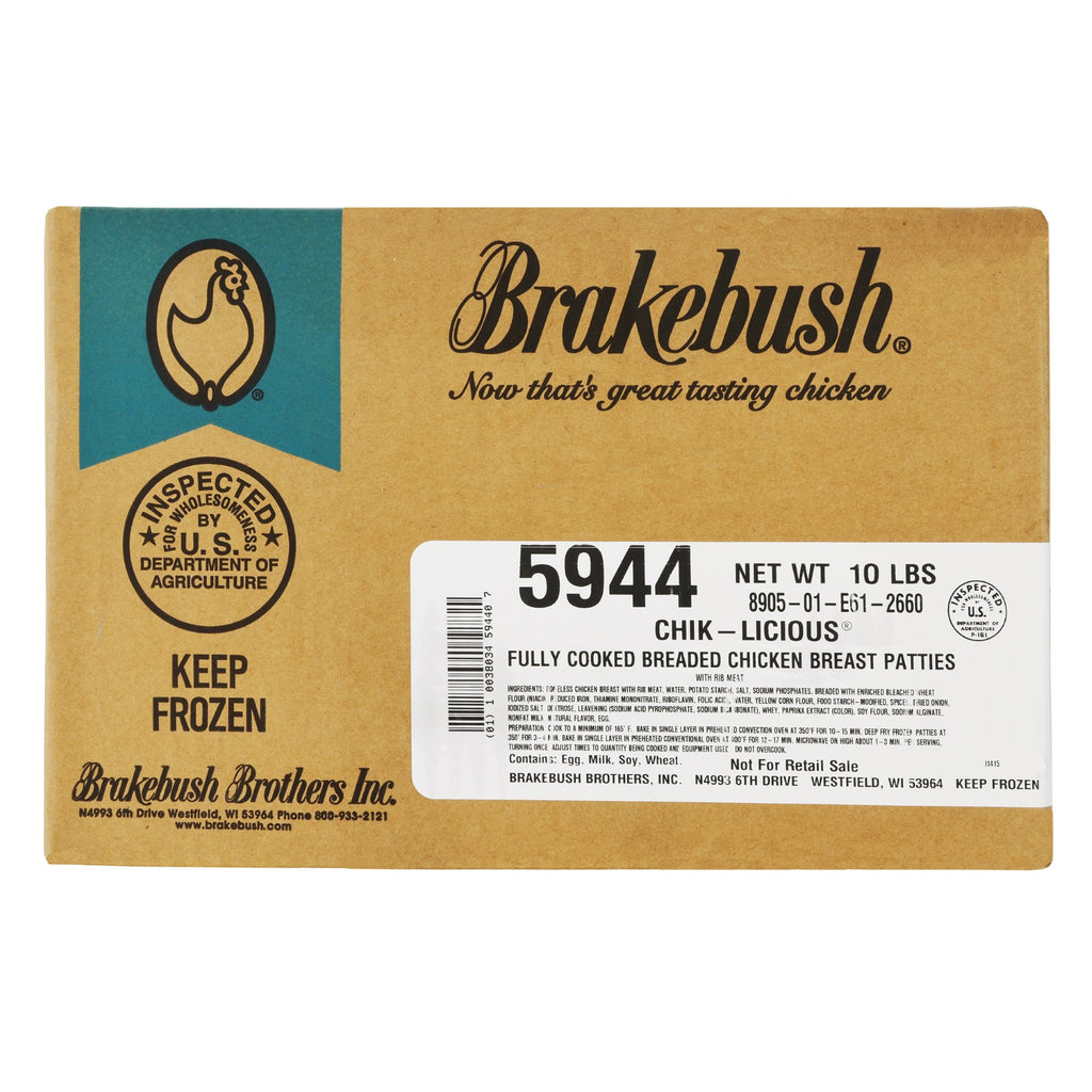 5944 - Fully cooked, breaded, all breast chicken patties with rib meat. Average 53/3 oz. and 1 = 1.25 oz. m/ma. Great for sandwiches, light lunches or kids' entrees.