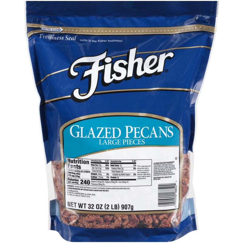 Fisher Glazed Pecan Pieces are oil-roasted and glazed with sugar, making them ready to use. The 2 LB resealable bag is the right size for most operations.