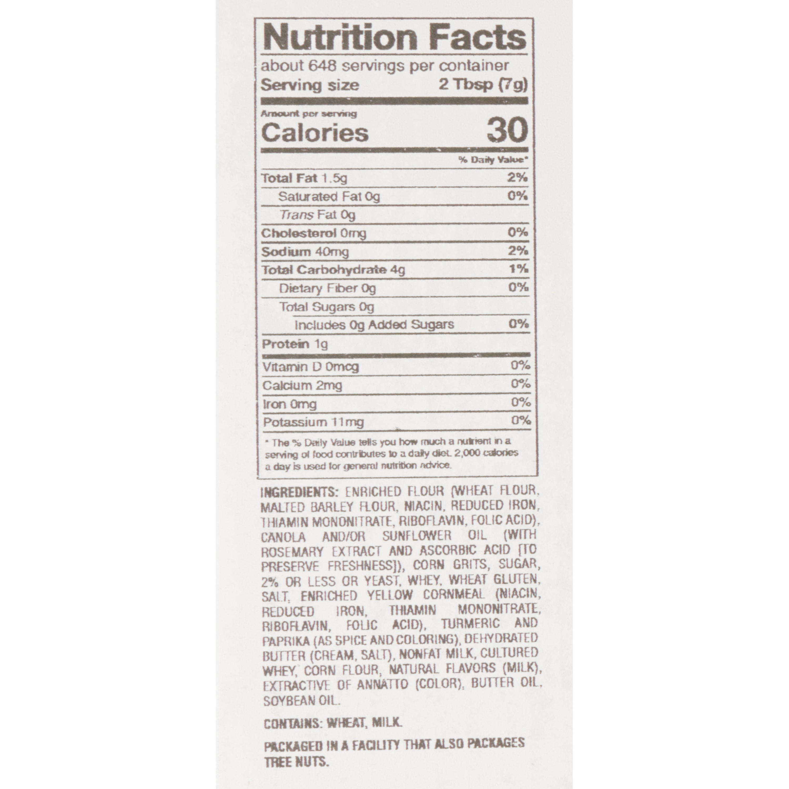 Ingredients: Enriched Flour (wheat Flour, Malted Barley Flour, Niacin, Reduced Iron, Thiamin Mononitrate, Riboflavin, Folic Acid), Canola And/or Sunflower Oil (with Rosemary Extract And Ascorbic Acid [to Preserve Freshness]), Corn Grits, Sugar, 2% Or Less Of Yeast, Whey, Wheat Gluten, Salt, Enriched Yellow Cornmeal (niacin, Reduced Iron, Thiamin Mononitrate, Riboflavin, Folic Acid), Turmeric And Paprika (as Spice And Coloring), Dehydrated Butter (cream, Salt), Nonfat Milk, Cultured Whey, Corn Flour, Natural Flavors (milk), Extractive Of Annatto (color), Butter Oil, Soybean Oil.