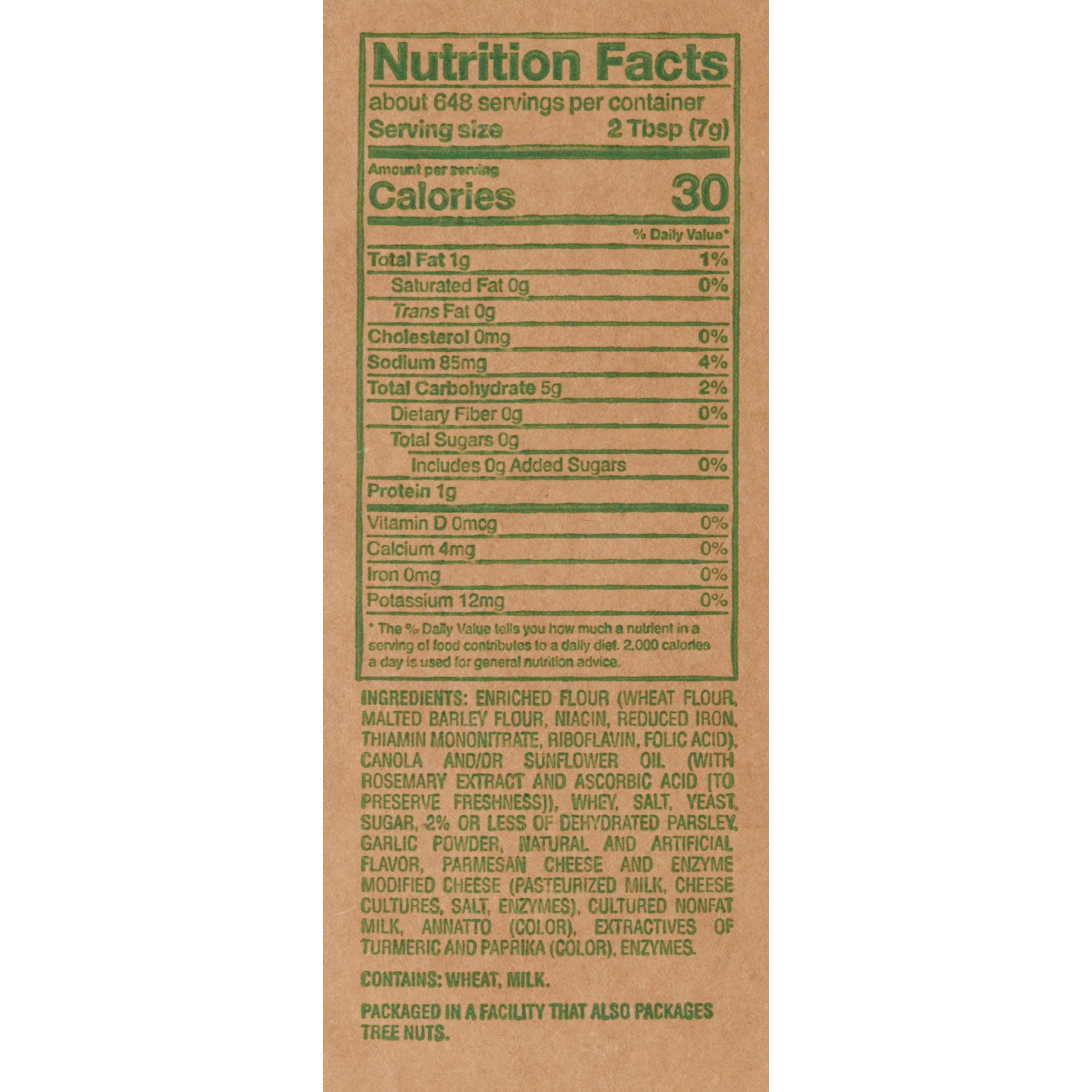 Ingredients: Enriched Flour (wheat Flour, Malted Barley Flour, Niacin, Reduced Iron, Thiamin Mononitrate, Riboflavin, Folic Acid), Canola And/or Sunflower Oil (with Rosemary Extract And Ascorbic Acid [to Preserve Freshness]), Whey, Salt, Yeast, Sugar, 2% Or Less Of Dehydrated Parsley, Garlic Powder, Natural And Artificial Flavor, Parmesan Cheese And Enzyme Modified Cheese (pasteurized Milk, Cheese Cultures, Salt, Enzymes), Cultured Nonfat Milk, Annatto (color), Extractives Of Turmeric And Paprika (color), Enzymes.