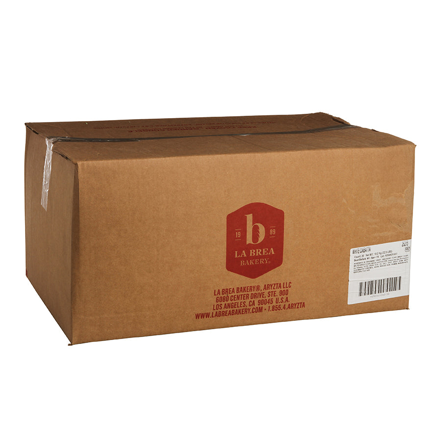 Storage: Frozen parbaked loaves are bulk packed in a cardboard case lined with apoly bag. Liner is folded over to cover loaves. Case is taped closed ontop and bottom. Store frozen.