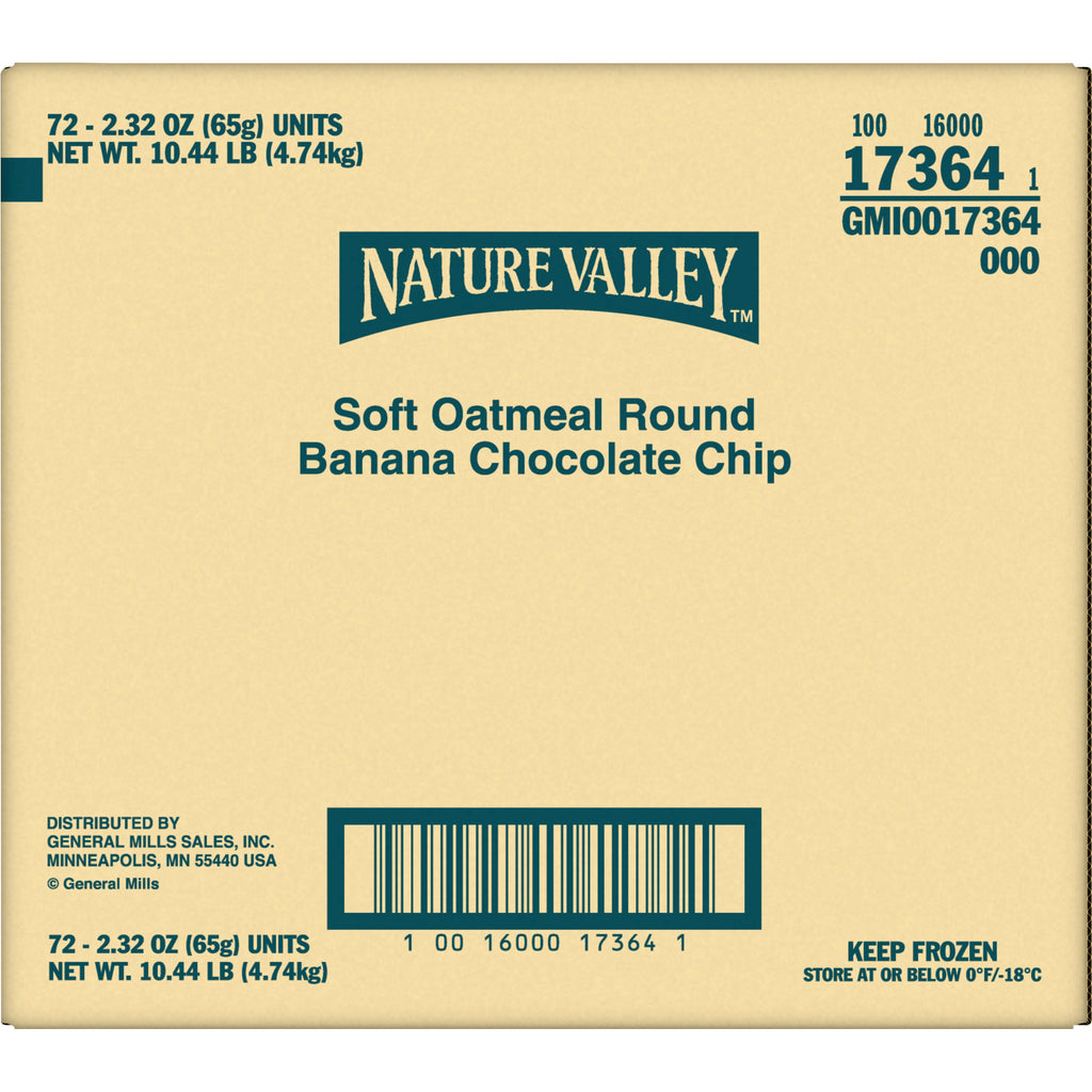 Nature Valley(TM) whole grain-rich, frozen, soft oatmeal rounds in individually wrapped, ovenable packages. Real banana puree and semi-sweet chocolate chips baked in for no-mess eating and 32 grams of whole grain per serving. For crediting in USDA Child Nutrition Programs: meets 2 ounce equivalent grain and whole grain-rich criteria. Options for Thaw & Serve or Heat & Serve.